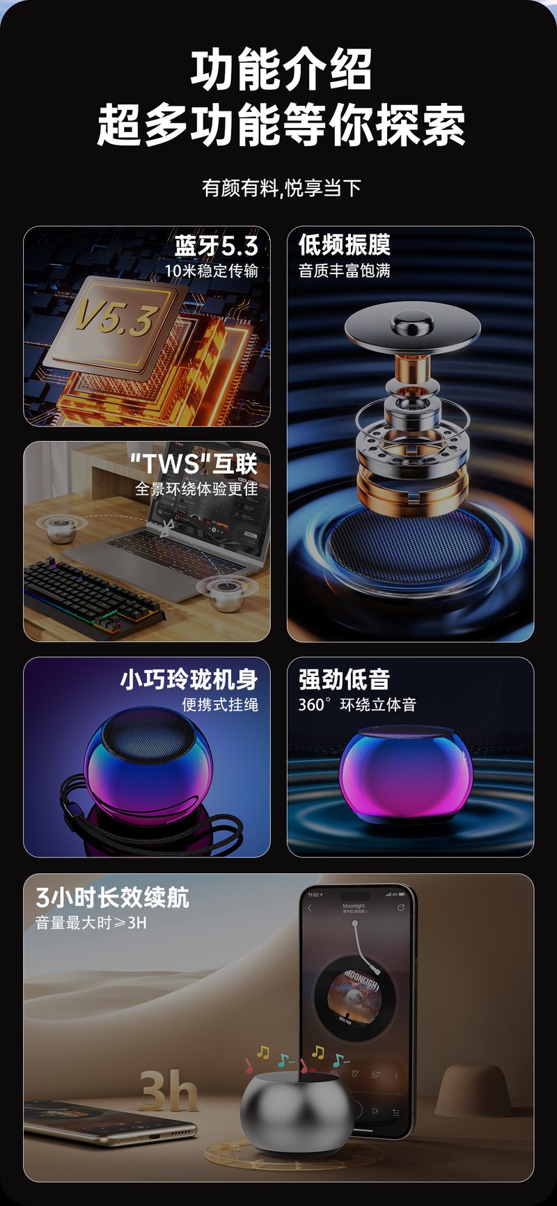 15分鐘前炫彩無線藍牙音箱,戶外便攜,小音響大音量,多重音效, 360°全向音效 - 3入組 均價433!NT$1299