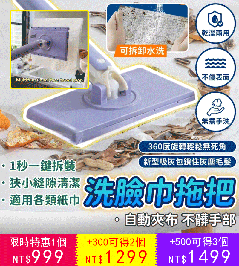 半小時前【2024設計獎得獎上新】免手洗懒人伸縮拖把,新升級設計,不在擔心拖把不好弄,新升級長度設計,同時不沾手放人工擰拖把,使打掃變得簡單 - 【今日限定 買一送一 2把+ 拖布*2包 】-NT$999